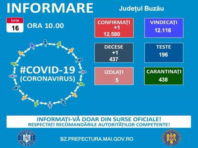 Astăzi, 16 iunie, situația epidemiologică la nivelul județului Buzău se prezintă astfel, conform datelor publicate de Prefectură: