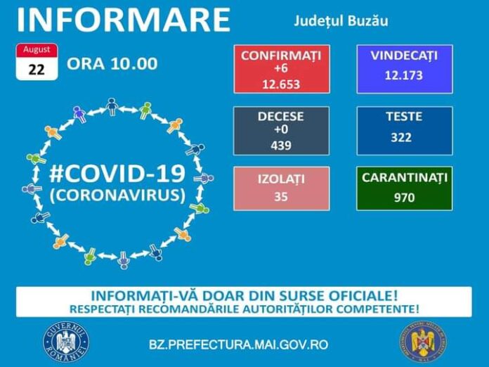 Astăzi, 22 august, situația epidemiologică la nivelul județului Buzău se prezintă astfel, potrivit informațiilor publicate de Prefectură:
