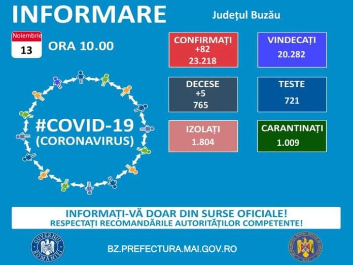 Conform datelor Direcției de Sănătate Publică, în ultimele 24 de ore, la nivelul județului Buzău, s-au inregistrat 82 cazuri noi de infectare cu noul coronavirus – COVID-19. Pacienții au vârste cuprinse între 8 și 91 de ani. Anchetele epidemiologice sunt în desfășurare.
