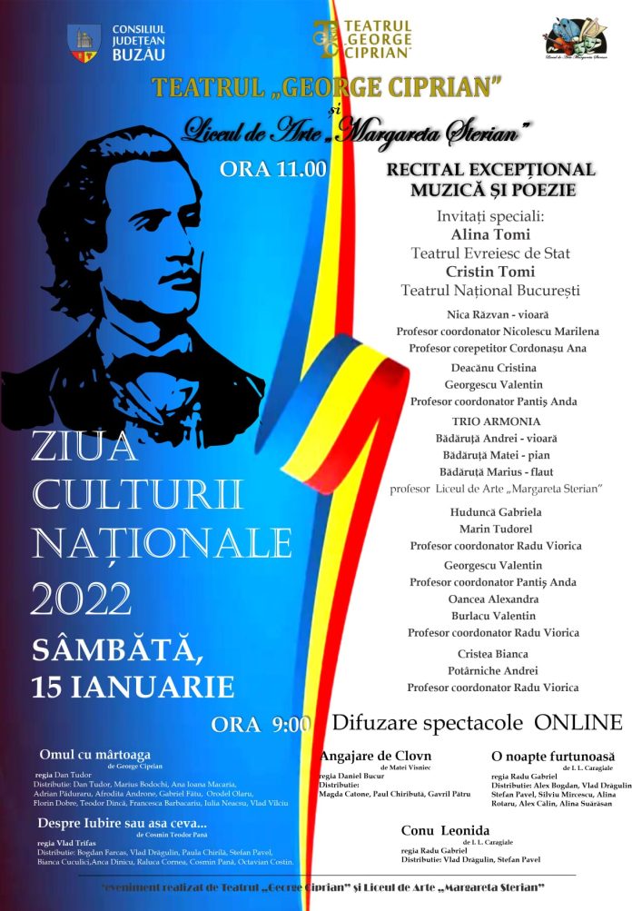 Tot pe 15 ianuarie, de la ora 11.00, publicul iubitor de muzică și poezie, dar nu numai, este invitat la Teatrul „George Ciprian, sala „Paul Ioachim”, pentru un recital excepțional! ???????̦? ???????? ai evenimentului ZIUA CULTURII NAȚIONALE 2022 sunt ????? ???i, actriță la ??????? ???????? ?? ????, și ??????? ????, actor al ???????ui ???̦????? ???????̦??. Alte momente vor fi susținute de elevi și profesori ai Liceului de Arte „Margareta Sterian”.