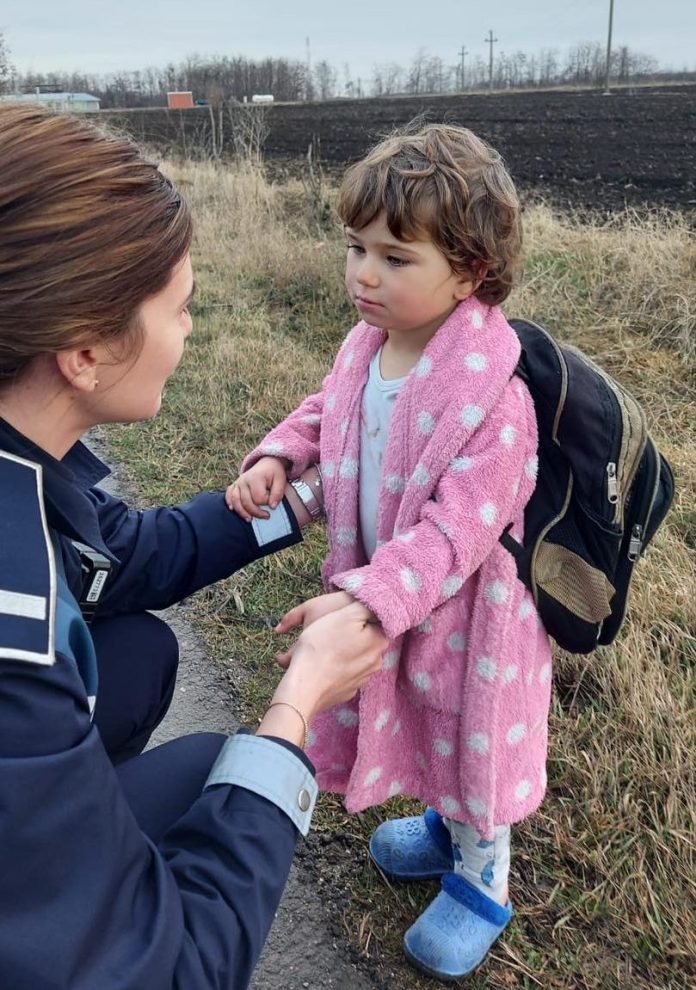 O zi de duminică… Mihaela şi Adrian, polițiști în Buzău, se îndreptau spre o intervenție prin apelul 112, doar că, pe traseul de deplasare, s-au confruntat cu o situaţie ce i-a determinat să pună stop o clipă, se impunea o prioritizare a urgenţelor: o fetiţă de 3 ani, în haine de casă, dar cu ghiozdan în spate, stătea singură în proximitatea drumului judeţean 203D. Astfel, alți colegi au fost redirecționați către adresa indicată prin 112.