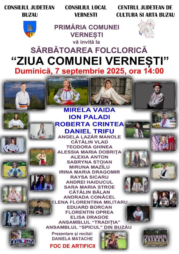 Localnicii din Vernești sunt invitați, duminică, 7 septembrie, la tradiționala sărbătoare a comunei. Evenimentul este organizat de Primărie și Consiliul Local. Startul petrecerii va fi la ora 14:00.