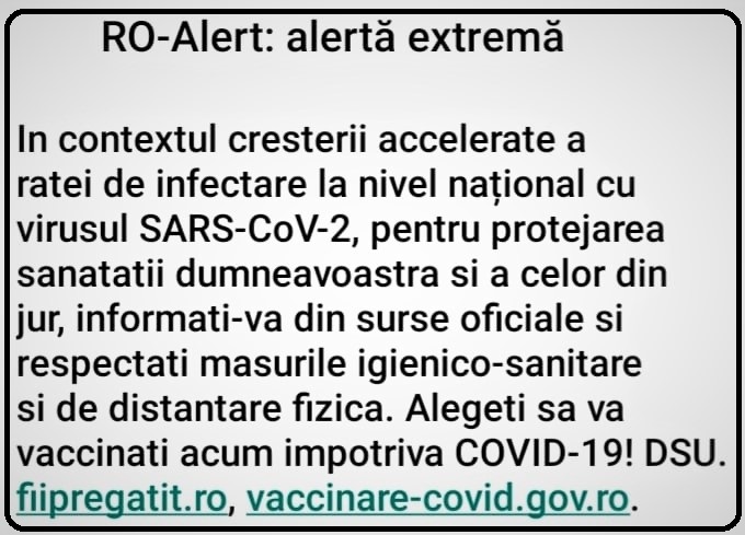 În urmă cu câteva minute, buzoienii au primit SMS prin sistemul RO-ALERT, de la Departamentul pentru Situații de Urgență, mesaj prin care se recomandă vaccinarea anti-COVID și precauție maximă, în contextul exploziei de cazuri de coronavirus.