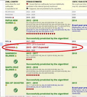 De la începutul anului, România a fost zguduită de o serie de 11 cutremure de intensitate medie, unele dintre ele fiind resimţite şi de oameni, nu doar de seismografe.Cutremurele de intensitate medie mai detensionează ceva din tensiunile acumulate între plăcile tectonice convergente la Curbura Carpaţilor, dar nu exclud acumularea energiei în sol, în aşa fel încât să se producă şi unul de intensitate mare (peste 6,7 grade pe scara Richter). Un cutremur de mare magnitudine s-ar putea produce în România, chiar în acest an, apreciază cel mai cunoscut sistem de monitorizare a seismelor din întreaga lume, „World Earthquakes”. Astfel, pe site-ul de internet al organizaţiei respective, România apare notată cu roşu, iar anul 2015 este cel trecut ca previziune pentru producerea unui mare seism. Sistemul se bazează pe date statistice potrivit cărora ţara noastră a trecut printr-un astfel de eveniment o data la 36, cel mult 38 de ani. Roşu înseamnă iminent, iar de la ultimul cutremur important înregistrat în România se împlinesc anul acesta 38 de ani. Replica specialiştilor români nu s-a lăsat aşteptată prea mult. Aceştia consideră că informaţiile difuzate de americani sunt exagerate şi că este imposibil pentru oricine să ghicească aşa ceva. Acelaşi sistem, bazat doar pe date statistice, a anunţat, de altfel, un astfel de cutremur în România şi anul trecut. Din fericire, s-a dovedit a fi o eroare. Reprezentanţii Institutului Naţional de Fizică a Pământului spun, însă, că problema unui mare seism nu ar trebui neglijată. „Ei fac nişte calcule statistice, iau toată activitatea cunoscută. Părerea mea e că au exagerat: au dat şi în 2014 la fel. Noi ştim că în zona Vrancea pot fi cutremure mai mari – dacă faci calcule simple poţi să te aştepţi – dar e imposibil să prezici anul. Ei fac o simplă estimare”, a spus Mircea Radulian, directorul I.N.F.P.