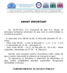 Compania de Apă va întrerupe joi, 29 septembrie, furnizarea serviciului de apă rece, pentru efectuarea unor lucrări de intervenție asupra sistemului de transport al apei, în conformitate cu următorul program: