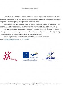 Asociaţia SUDCARPATICA anunţă deschiderea oficială a proiectului “Preserving the Local Traditions and Customs in the New European Context”, proiect finanţat de Comisia Europeană prin Programul ‘Tineret în acţiune”, sub-acţiunea 1.1. “Schimb de tineri”. Acest proiect este unul bilateral, avand ca partener o instituţie publică de tineret din Turcia (GENÇLİK HİZMETLERİ VE SPOR İL MÜDÜRLÜĞÜ GENÇLİK MERKEZİ MÜDÜRLÜĞÜ). Acţiunea principală se desfasoară în Pătârlagele în perioada 18 -28 iulie. În aceste 10 zile vor fi activităţi ce vor avea ca teme: gastronomia românească şi turcească; istorie comună; religie; tradiţii româneşti şi turceşti; tinerii şi Uniunea Europeană; aspecte educaţionale.