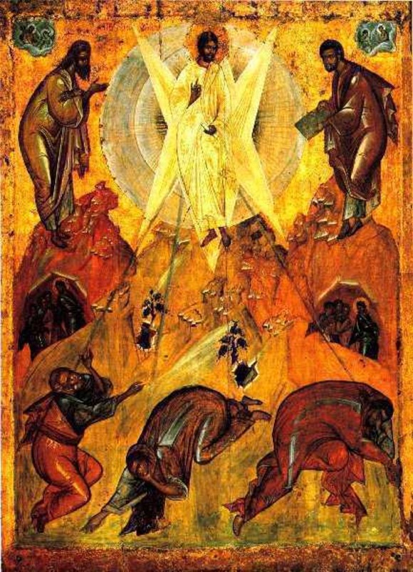 Iisus „S-a Schimbat la faţă înaintea lor, şi a strălucit faţa Lui ca soarele, iar hainele Lui s-au făcut albe ca lumina. Şi s-au arătat lor Moise şi Ilie , vorbind cu El”. (Matei-17, 2-3). Atunci ucenicii s-au speriat, iar pe când contemplau lumina dumnezeiască au trăit momente de iluminare. Petru i-a spus lui Iisus: „ Doamne, bine este să fim noi aici, iar dacă voieşti, voi face trei colibe : Ţie una, lui Moise una şi lui Ilie una.”În timp ce Petru vorbea cuprins de euforie, un nor s-a coborât asupra ucenicilor, i-a umbrit, iar din cer s-a auzit un glas: „Acesta este Fiul meu Cel iubit, în care am binevoit; pe Acesta să-L ascultaţi!” Auzind acel glas, ucenicii au căzut cu faţa la pământ şi s-au înspăimântat foarte” (potrivit mărturiei Evanghelistului Matei 17, 2-6). În acele momente emoţionante, Iisus S-a apropiat de ucenici şi Le-a zis: „Sculaţi-vă şi nu vă temeţi!”.