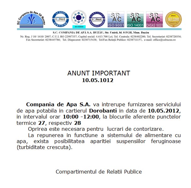 Compania de Apa S.A. va intrerupe furnizarea serviciului de apa potabila in cartierul Dorobanti in data de 10.05.2012, in intervalul orar 10:00 -12:00, la blocurile aferente punctelor termice 27, respectiv 28. Oprirea este necesara pentru lucrari de contorizare.