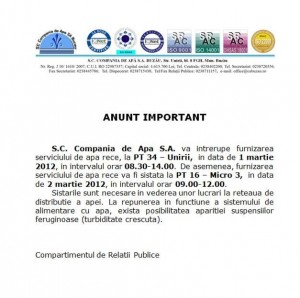 S.C. Compania de Apa S.A. va intrerupe furnizarea serviciului de apa rece, la PT 34 – Unirii, in data de 1 martie 2012, in intervalul orar 08.30-14.00. De asemenea, furnizarea serviciului de apa rece va fi sistata la PT 16 – Micro 3, in data de 2 martie 2012, in intervalul orar 09.00-12.00.