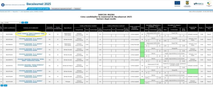 Primul clasat pe județ provine de la Liceul Teoretic ,,Radu Vlădescu” din Pătârlagele, cu media 9.97, urmat de patru absolvenți de la Hasdeu (medii între 9.93 și 9.95).