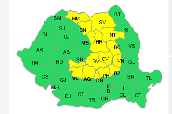 Potrivit Administraţiei Naţionale de Meteorologie, miercuri, până la ora 20.00, sunt sub avertizare cod galben judeţele Maramureş, Bistriţa-Năsăud, Mureş, Harghita, Covasna, Braşov, Sibiu, Vâlcea, Argeş, Dâmboviţa, Prahova, Buzău, Vrancea, Bacău, Neamţ şi Suceava.