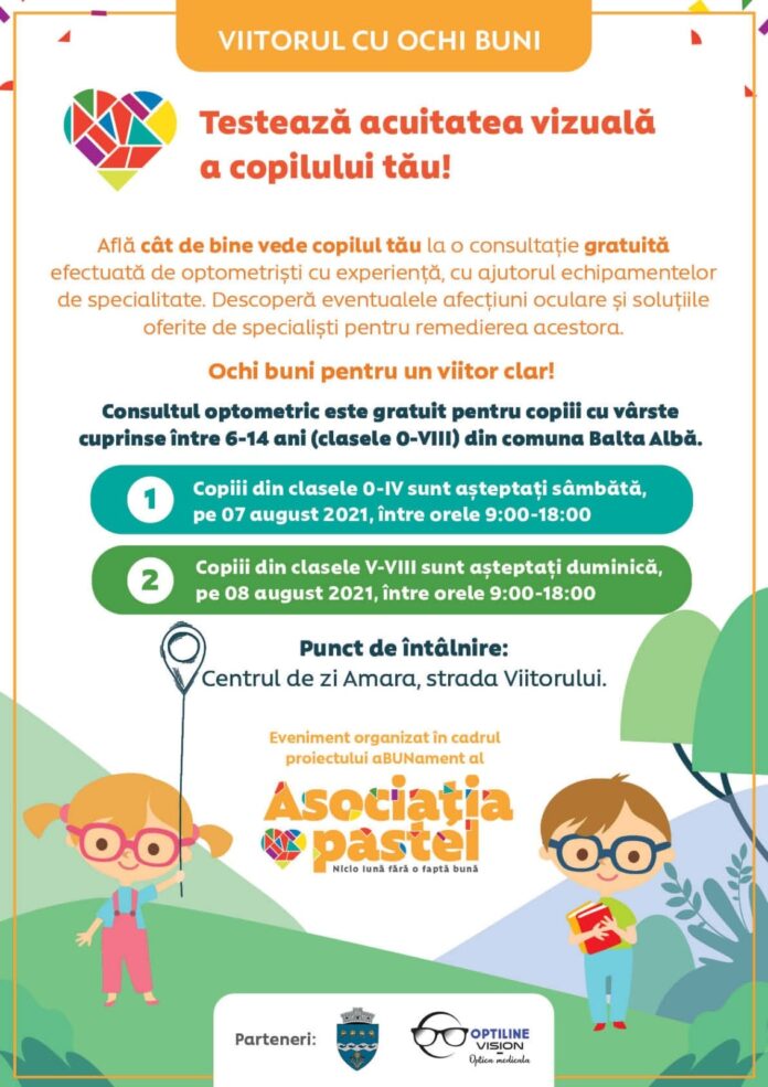 Copiii, cu vârste între 6 – 14 ani, vor putea beneficia de consult oftalmologic gratuit, grație unei acțiuni derulate de ,,Asociația pastel”, în colaborare cu Primăria Balta Albă. Acțiunea se va desfășura în weekend-ul 7-8 august, la Centrul de zi Amara.