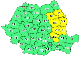 7 județe, respectiv Buzău, Vrancea, Galați, Vaslui, Bacău, Neamț și Iași se află sub cod galben de viscol și ninsori valabil până astăzi, ora 12:00. ,,În județele menționate, vor fi ninsori ce vor depune strat nou de zăpadă consistent, iar vântul se va intensifica, temporar cu rafale de 60…65 km/h, viscolind sau spulberând zăpada și determinând scăderea vizibilității”, mai anunță Administrația Națională de Meteorologie.