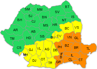 Sub avertizare cod galben vor fi judeţele Vaslui, Bacău, Covasna, Braşov, Dâmboviţa, Teleorman, Argeş, Vâlcea, Olt, Dolj, Giurgiu şi Mehedinţi.