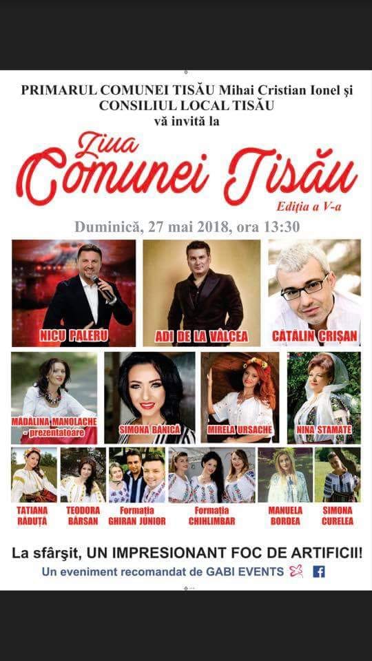 Duminică, 27 mai 2018, la orele 13.30, pe terenul de sport din localitate, se organizează ediţia a cincea a Zilei Comunei Tisău, sărbătoare devenită deja tradiţie în zonă.