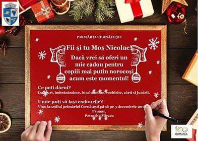 „Vino in perioada 29.11-05.12.2018 la sediul Primariei si doneaza jucarii, haine si orice alte lucruri care tie iti prisosesc dar care ar putea face fericit un copil. Haideti sa dovedim inca o data ca suntem o comunitate si sa-l ajutam pe Mos Nicolae sa ajunga si la acei copii pe care norocul i-a ocolit de atatea ori!”, se arata in mesajul postat pe pagina de socializare de primarul din Cernatesti.