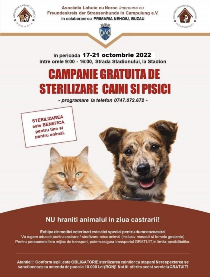 „Partener serios, profesionist și constant în acțiuni de acest fel, Asociația ”Lăbuțe cu Noroc” & Freundeskreis der Strassenhunde in Campulung e.V, asigură organizarea acestei acțiuni în colaborare cu Primăria Orașului Nehoiu.” , anunță primarul Ionuț Milea.