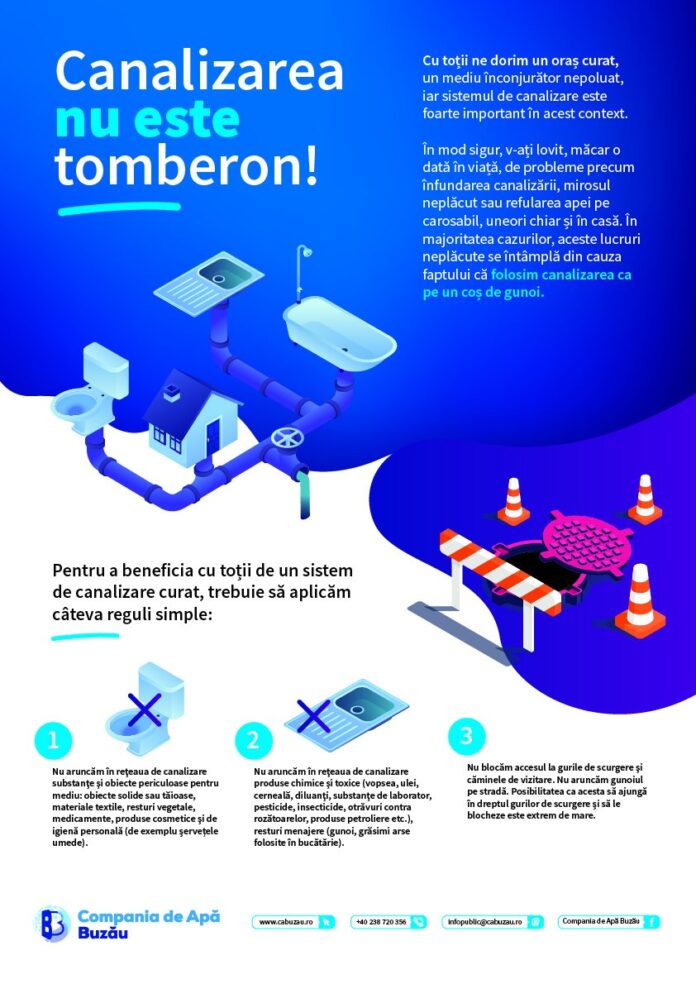 Șervețelele umede, uleiul uzat, materialele textile, obiectele de igienă sau resturile alimentare pot bloca rețeaua și pot afecta stațiile de epurare. Fiecare gest responsabil protejează apa. O toaletă folosită corect înseamnă mai puține avarii, un mediu mai curat și un sistem sigur pentru toți. Igiena începe cu educația. Prin alegerile noastre zilnice contribuim la sănătatea comunității și la protejarea resurselor de apă.