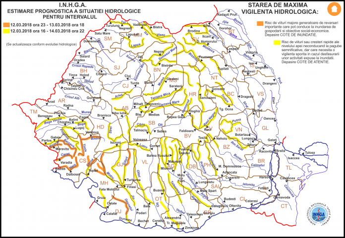 Avertizarea este valabilă pentru intervalul 13 martie, ora 09:00 – 14 martie, ora 22:00 și vizează râurile din bazinele hidrografice: Mureș – bazin superior amonte confluența Arieș (județele Harghita, Bistrița Năsăud și Mureș), Târnave (județele Harghita, Mureș, Sibiu și Alba), Călmățui (județele Olt și Teleorman), Vedea – bazin superior și afluenți bazin mijlociu și inferior (județele Vâlcea, Olt, Argeș și Teleorman), Argeș – bazin superior (județul Argeș), Dâmbovița – bazin superior (județele Argeș și Dâmbovița), Neajlov (județele Argeș, Dâmbovița și Giurgiu), Ialomița – bazin superior și afluenti bazin mijlociu și inferior (județele Dâmbovița și Prahova), Buzău – bazin superior și afluenți bazin mijlociu (județele Brașov, Covasna și Buzău), bazinele superioare și afluenții din bazinele mijlocii și inferioare ale râurilor: Suceava, Moldova, Bistrița, Trotuș, Putna și Râmnicu Sărat (județele Suceava, Neamț, Harghita, Bacău, Vrancea, Covasna și Buzău).