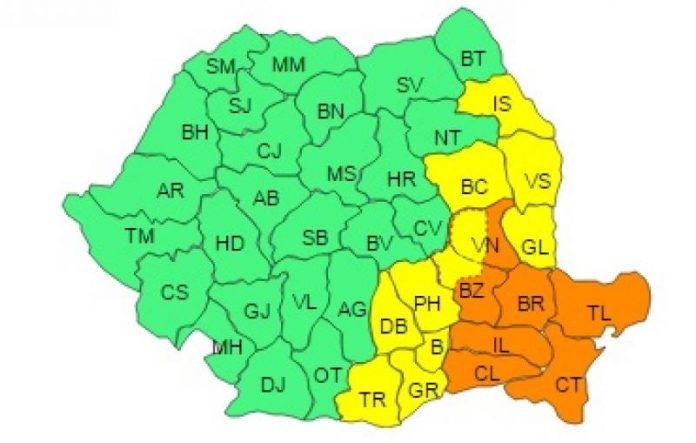 Meteorologii au emis un cod portocaliu de ninsori, viscol și polei pentru sud-estul țării, care va intra în vigoare în această seară, de la ora 22:00, și este valabil până miercuri, la ora 8:00. Sunt vizate șapte județe.