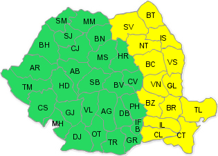 Mai exact, codul galben de ninsori viscolite, intensificări ale vântului şi precipitaţii mixte va fi valabil în 14 judeţe din estul, nord-estul şi sud-estul ţării. În Moldova va ninge viscolit şi se va depune un strat nou de zăpadă de 10-15 cm, în Dobrogea si estul Munteniei ploile se vor transforma în lapoviţă şi ninsoare.