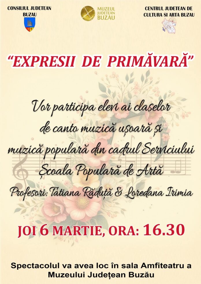 Astăzi, 6 martie, elevii claselor de canto ale profesoarelor Tatiana Răduță și Loredana Irimia, din cadrul Centrului Județean de Cultură și Artă Buzău, vor încânta publicul cu muzică ușoară și muzică populară.