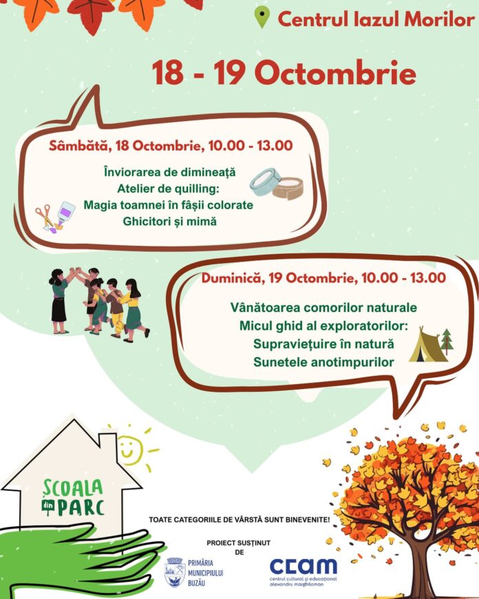 Noi activități în cadrul proiectului Școala din Parc. Organizatorii îi invită pe copii la Centrul Iazul Morilor, pe 18 și 19 octombrie, pentru două zile pline de joacă, curiozități și descoperiri frumoase.