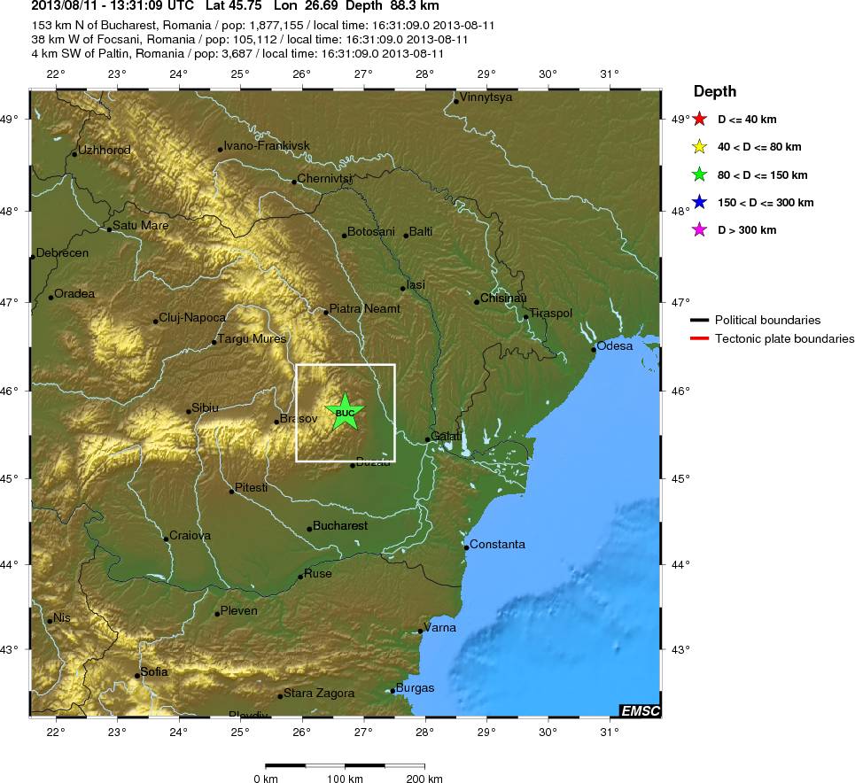 Potrivit datelor publicate de Institutul National de Cercetare-Dezvoltare pentru Fizica Pamantului, cutremurul a avut loc la ora locala 16h31min09sec, iar epicentrul sau a fost localizat in Muntii Vrancei, zona PALTIN-NEREJU (45,75 grade latitudine Nordica, 26,69 grade longitudine Estica).