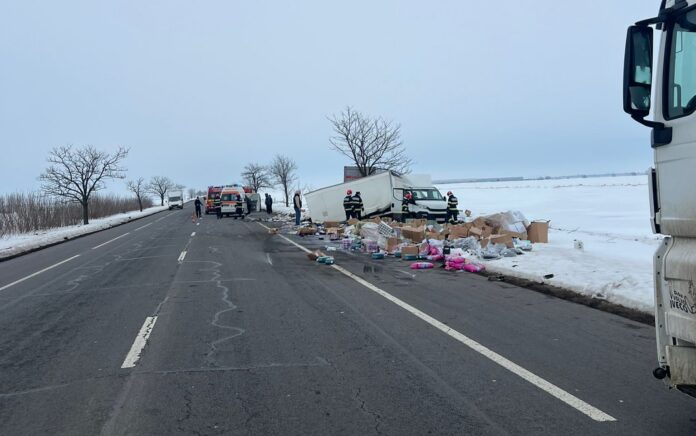 În urma impactului, aproape toată marfa aflată într-unul dintre autocamioane s-a împrăstiat pe șosea și pe câmp.