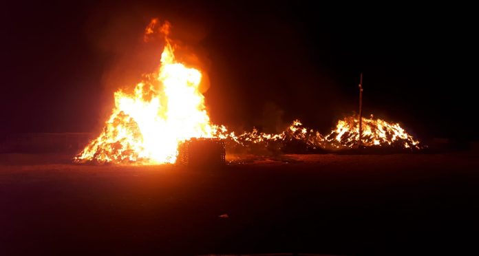 Incendiu de proporții, azi-noapte, în satul Lanuri (comuna Ziduri), la un depozit de furaje. La fața locului au fost mobilizate trei autospeciale de lucru cu apă și spumă din cadrul Detașamentului de Pompieri Râmnicu Sărat.buzau, furaje, incendiu, Lanurile, pompieri, rm sarat, ziduriAjunși la fața locului, pompierii au constatat că furajele erau cuprinse în întregime de flăcări, cu pericol de extindere la adăposturile de animale din vecinatatea zonei de ardere.buzau, furaje, incendiu, Lanurile, pompieri, rm sarat, ziduri„În scurt timp, aceștia au localizat incendiul, acționand în continuare pentru stingerea acestuia. Totodată, dat fiind pericolul de extindere al incendiului, dar și căldura degajată de focarul inițial care punea în pericol viața animalelor aflate în adăposturile din proximitatea acestuia, pompierii au luat decizia de a le evacua, într-un loc sigur.buzau, furaje, incendiu, Lanurile, pompieri, rm sarat, ziduriSalvatorii au rămas la fața locului până la înlăturarea oricărui pericol de reaprindere a incendiului, intervenția finalizându-se după aproximativ 5 ore. buzau, furaje, incendiu, Lanurile, pompieri, rm sarat, ziduriLa finalul intervenției, ca pagube, au fost înregistrate aproximativ 6 tone de furaje și 4.000 de paleți din lemn.” , se precizează într-o informare a ISU Buzău. buzau, furaje, incendiu, Lanurile, pompieri, rm sarat, ziduri