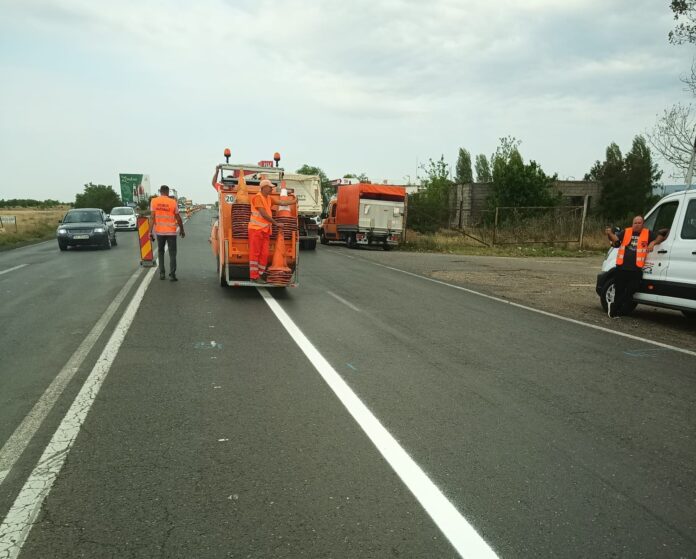 Astăzi, drumarii au trecut la efectuarea marcajelor rutiere conforme cu noul proiect de sistematizare a traficului pe tronsonul cuprins între Pasarele Nehoiu și Hanul lui Țintă.