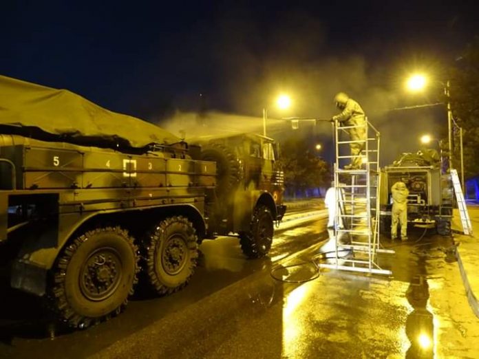 Începând cu seara zilei de 7 aprilie, militarii detașamentului Batalionului 202 Apărare CBRN au executat, cu șapte autospeciale, dezinfecția pe principalele artere rutiere din municipiul Suceava.