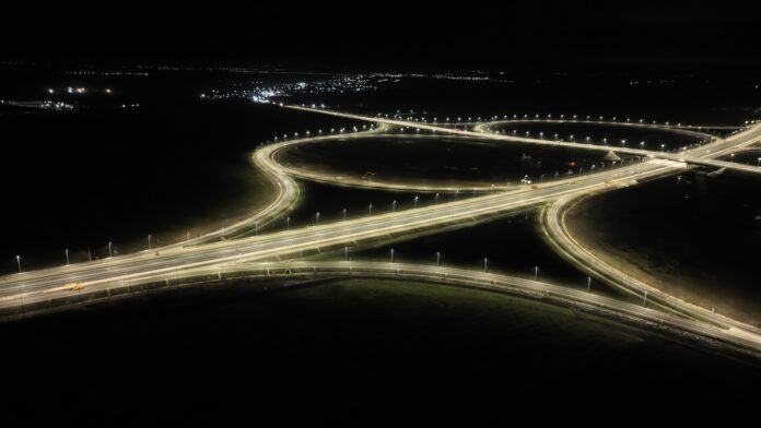 Imagini spectaculoase vin de la Direcția Regională de Drumuri și Poduri Buzău, imagini captate dintr-o filmare realizată cu drona, surprinse noaptea pe lotul 3 al autostrăzii A7 (Pietroasele – Buzău), tronson care va fi deschis astăzi, la ora 15:00.