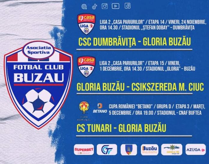Gloria Buzău mai are de disputat trei meciuri oficiale în acest an, două în campionatul Ligii secunde și unul în Cupa României.
