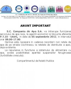anunt, apa potabila, Compania de Apa, intreruperi, pt 10, UniriiS.C. Compania de Apa S.A. va intrerupe furnizarea serviciului de apa rece, la agentii economici si blocurile aferente P.T.10 – Unirii,  in data de 05 septembrie 2012, in intervalul orar 08.00-17.00. Oprirea este necesara in vederea racordarii noii retele de apa de pe strada Ciochinescu la retelele de distributie a apei, deja existente. La repunerea in functiune a sistemului de alimentare cu apa, exista posibilitatea aparitiei suspensiilor feruginoase (turbiditate crescuta).