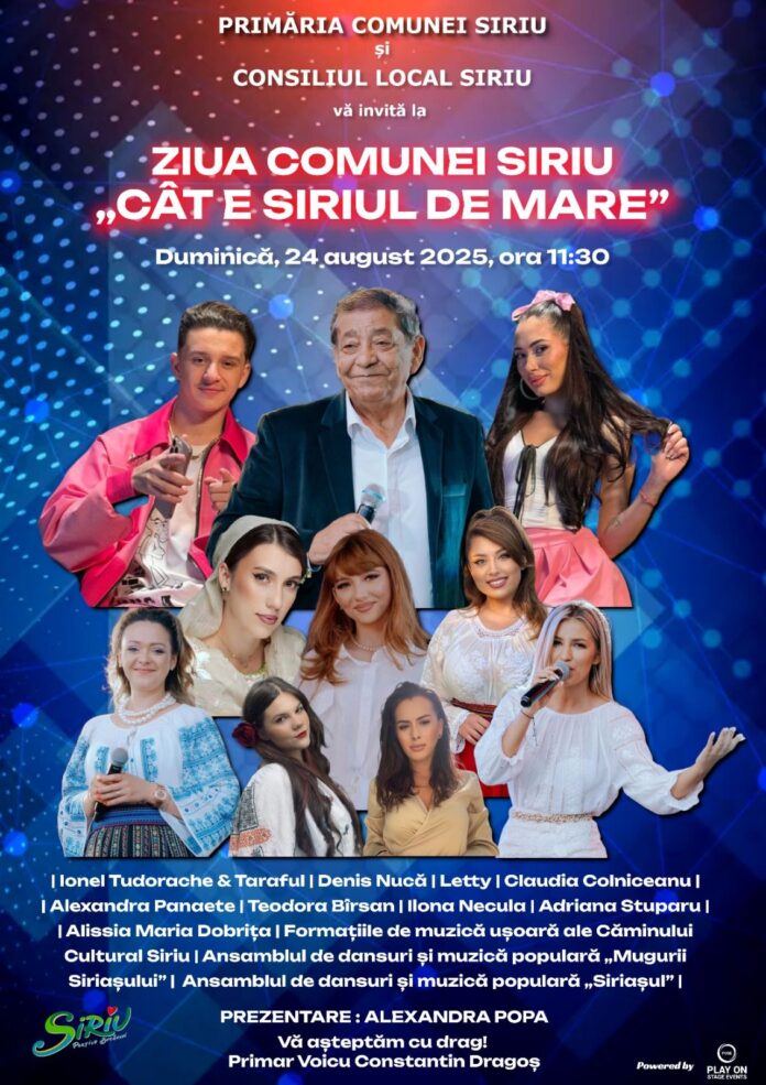 Așadar, cu bucurie, vă invit duminică, 24 august 2025, începând cu ora 11:30, să sărbătorim împreună Ziua Comunei Siriu – „Cât e Siriul de mare”. Am pregătit pentru voi o zi plină de muzică, dans, voie bună și momente speciale, alături de artiști îndrăgiți și ansambluri locale care duc mai departe sufletul și tradițiile locului nostru. Nu lăsăm greutățile să ne răpească zâmbetul și dorința de a ne simți bine împreună, ca o mare familie. Pentru că Siriul nu înseamnă doar locuri frumoase, ci mai ales oameni frumoși – cu inima mare, muncitori, buni și primitori.
