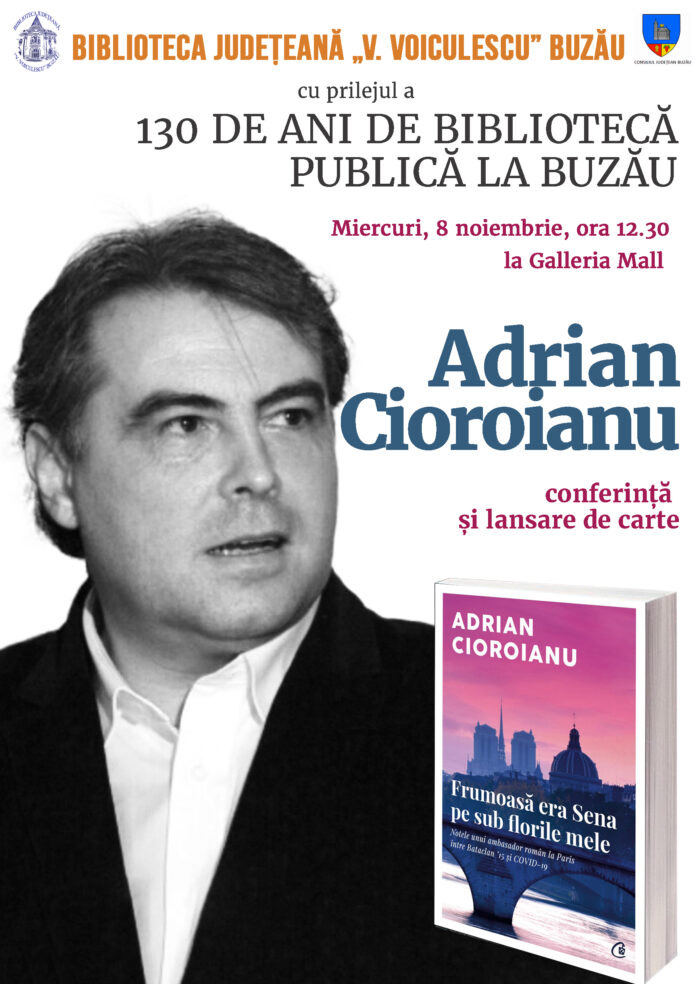 ,,Adrian Cioroianu va susține o conferință în cadrul manifestărilor prilejuite de împlinirea a 130 de ani de bibliotecă publică la Buzău. Cu aceeași ocazie, istoricul își va lansa cartea „Frumoasă era Sena pe sub florile mele”, apărută în acest an la Curtea Veche Publishing, și va oferi autografe celor prezenți.