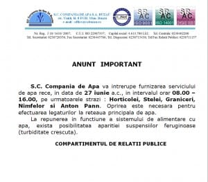anunt, Compania de Apa, lucrari, oprire apaBuzoienii care locuiesc în cartierul Dorobanţi, în blocurile deservite de punctul termic nr. 28 rămân fără apă la robinete joi 7 iulie, între orele 09.00 și 18.00, anunță Compania de Apă printr-un comunicat.