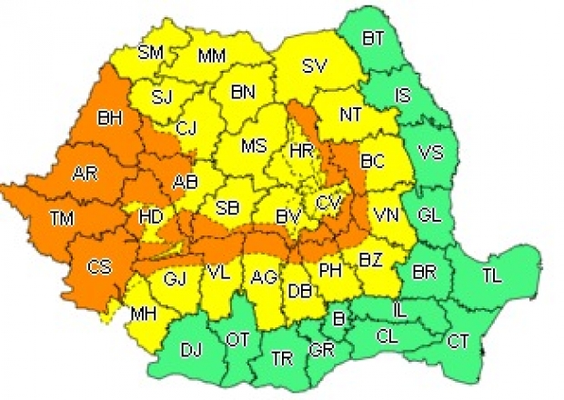 Avertizarea Cod portocaliu vizează 19 județe și va fi în vigoare miercuri de la ora 17.00 până vineri la ora 11.00.