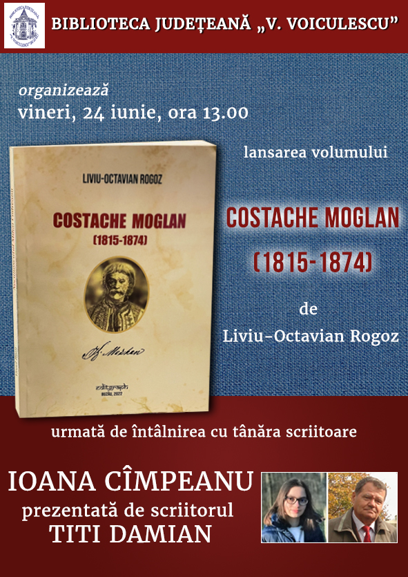 Biblioteca Județeană „V. Voiculescu” Buzău organizează vineri, 24 iunie, de la ora 13:00, lansarea cărții „Costache Moglan (1815-1874)”, semnată Liviu-Octavian Rogoz, eveniment cu ocazia căruia va fi prezentată și o tânără speranță pentru literatura buzoiană, eleva Ioana Cîmpeanu.