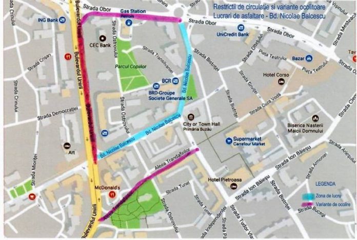 Primarul municipiului Buzău, Constantin Toma anunță că începând de astăzi, ca urmare a lucrărilor de asfaltare ce se vor derula pe perioada zilei, traficul pe Bulevardul Nicolae Bălcescu, tronson cuprins intre Proiect SA și strada Obor va fi restricționat. Totuși sunt oferite două rute alternative.