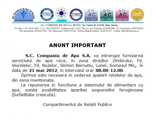 S.C. Compania de Apa S.A. va intrerupe furnizarea serviciului de apa rece, in zona strazilor Zimbrului, Fd. Viorelelor, Fd. Rozelor, Simion Barnutiu, Lunei, Somesul Mic, in data de 21 mai 2012, in intervalul orar 08.00-12.00.