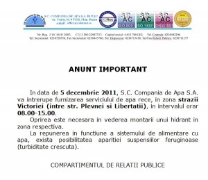 In data de 5 decembrie 2011, S.C. Compania de Apa S.A. va intrerupe furnizarea serviciului de apa rece, in zona strazii Victoriei (intre str. Plevnei si Libertatii), in intervalul orar 08.00-15.00.