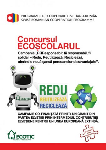 000000ecoscolarECOTIC şi Ateliere Fără Frontiere desfășoară în perioada 01.07.2013 – 30.06.2014 proiectul denumit „RRResponsabil: fii responsabil, fii solidar – Redu, Reutilizează, Reciclează, oferind o nouă şansă persoanelor dezavantajate” cu sprijinul Ministerului Mediului şi Schimbărilor Climatice. ACEST PROIECT ESTE CO-FINANȚAT PRINTR-UN GRANT DIN PARTEA ELVEȚIEI PRIN INTERMEDIUL CONTRIBUȚIEI ELVEȚIENE PENTRU UNIUNEA EUROPEANĂ EXTINSĂ.