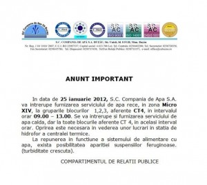 In data de 25 ianuarie 2012, S.C. Compania de Apa S.A. va intrerupe furnizarea serviciului de apa rece, in zona Micro XIV, la gruparile blocurilor 1,2,3, aferente CT4, in intervalul orar 09.00 – 13.00. Se va intrerupe si furnizarea serviciului de apa calda, dar la toate blocurile aferente CT 4, in acelasi interval orar. Oprirea este necesara in vederea unor lucrari in statia de hidrofor a centralei termice.
