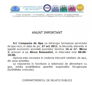 Compania de Apa, lucrari, oprire apaS.C Compania de Apă va întrerupe furnizarea serviciului de apă rece, mâine 27 octombrie 2011, la blocurile aferente și agenții economici arondați punctelor termice 16 și 17– Micro 3, precum și pe Aleea Romaniței, în intervalul orar 08.00-18.00.