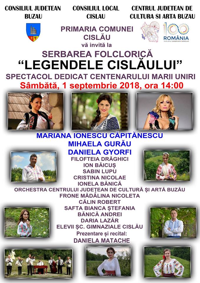 Primăria comunei Cislău, in parteneriat cu Consiliul Judetean organizează cea de-a XIII-a ediție a sărbătorii folclorice ”Legendele Cislăului”, spectacol dedicat centenarului marii uniri.