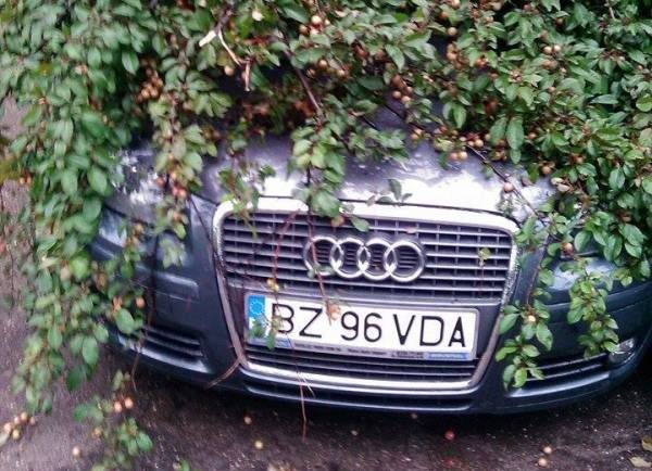 Din cauza vântului puternic, un copac aflat în vecinătatea unui bloc din zona Pieței Crâng, s-a rupt și a căzut pe un autoturism Audi parcat în vecinătate, plafonul mașinii fiind avariat serios. Proprietarul a chemat pompierii și spune că va cere despăgubiri de la Primăria Buzău. La răspundere ar putea fi trasă și administrația blocului.