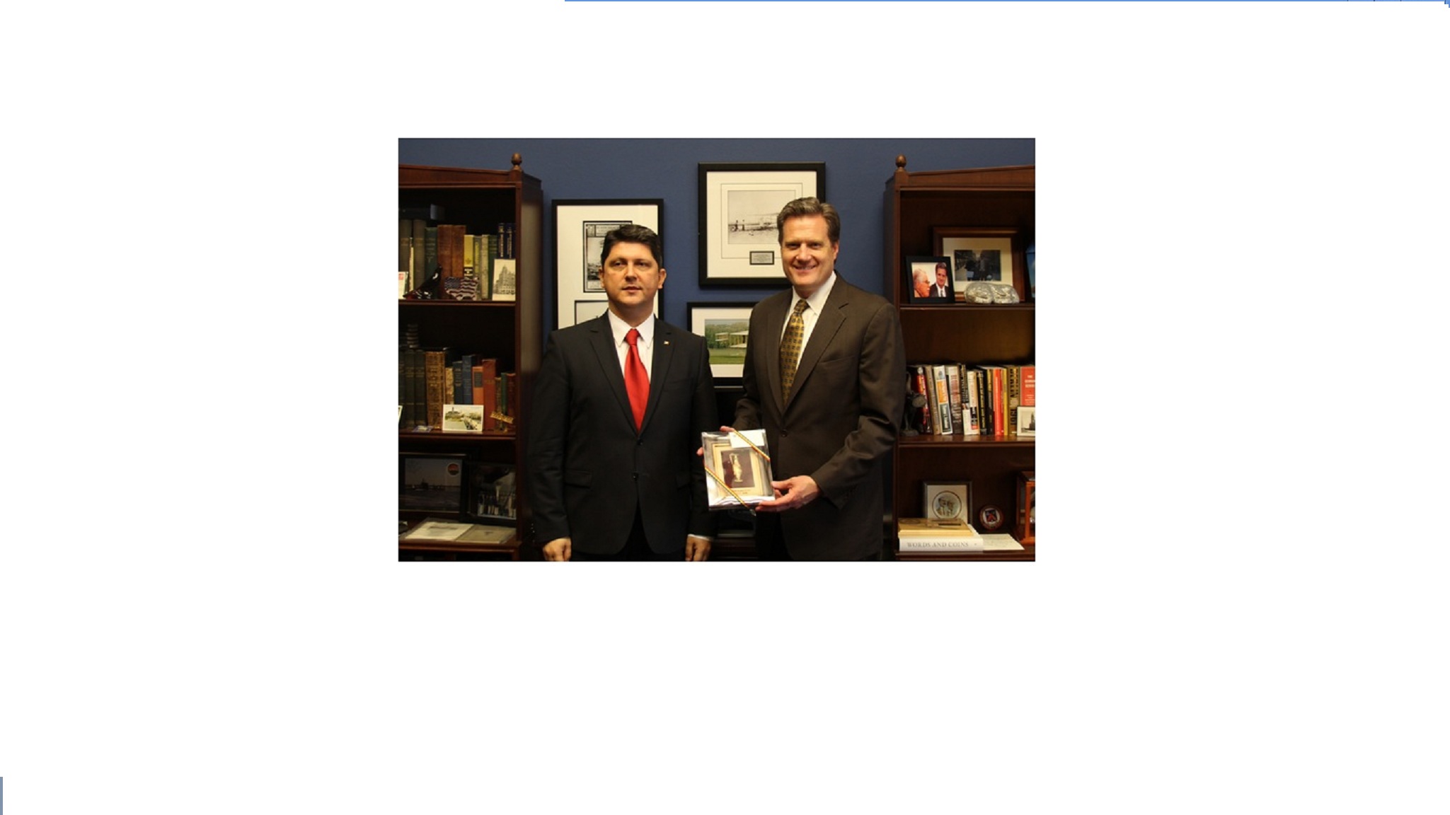 O minireplică a Tezaurului de la Pietroasa- Cloşca cu Puii de Aur – AMFORA – CĂNIŢĂ – a fost oferită lui Michael Turner (republican, Ohio), co-președinte al Grupului de Prietenie pentru România (Romanian Congressional Caucus), președinte al Subcomitetului pentru Forțe Aeriene Tactice din Comitetul pentru Apărare, președinte al Delegației Congresului SUA la Adunarea Parlamentară a NATO, membru senior al Subcomitetului pentru Forțe Strategice din Comitetul pentru Apărare și al Comitetului de Supraveghere și Reformă Guvernamentală din Camera Reprezentanțiloro întrevedere cu congresmanul Michael Turner (republican, Ohio), Preşedintele Grupului de prietenie cu România – Romanian Caucus – din Congresul SUA, Preşedinte al Delegaţiei Congresului SUA la Adunarea Parlamentară a NATO, precum şi Preşedinte al Subcomitetului pentru Forţe Aeriene şi Terestre Tactice din Camera Reprezentanţilor.