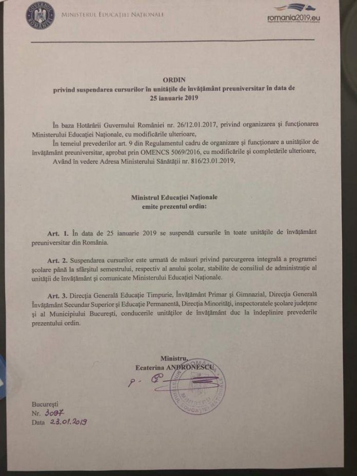 Potrivit junui ordin emis în urmă cu puțin timp, cursurile vor fi suspendate în toate unitățile de învățământ preuniversitar din România.